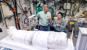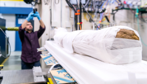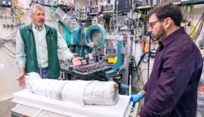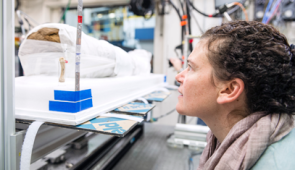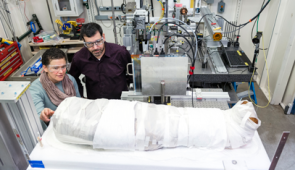 On Nov. 27, 2017, Stuart R. Stock, research professor of cell and molecular biology at Northwestern’s Feinberg School of Medicine, worked with Argonne National Laboratory technicians to conduct the first X-ray scattering experiment on a human mummy. The high-energy synchrotron X-rays produced by Argonne’s Advanced Photon Source probed inside the mummy to help identify materials and objects, while leaving the mummy and her wrappings intact. Photo credit Jim Prisching.