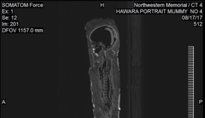 Prior to its Nov. 27 trip to Argonne National Laboratory, the mummy had a CT scan at Northwestern Memorial Hospital in August 2017. The scan gave researchers a 3-D map of the structure, revealing opaque areas meriting a closer look with the synchrotron experiment at Argonne. The CT scan also enabled them to confirm the girl is 5 years old (give or take nine months). Images courtesy of Northwestern University.