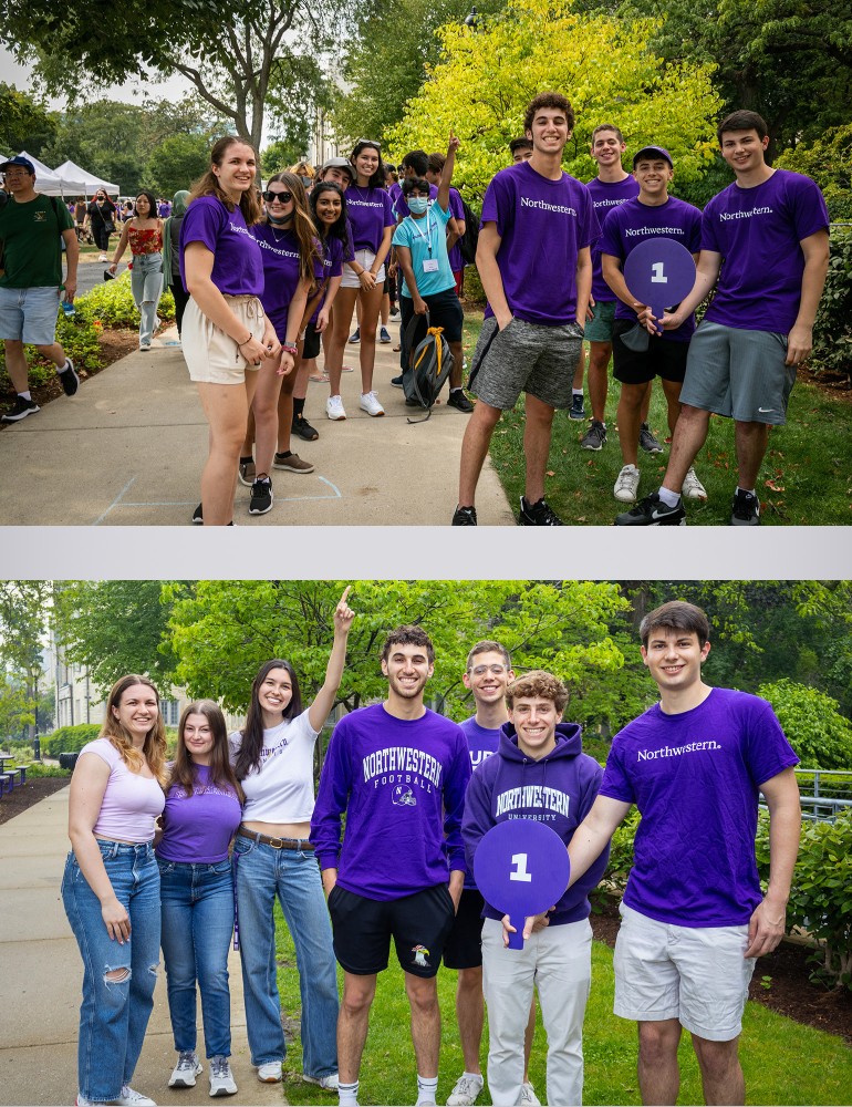 Then and now: Students from Peer Adviser Group 1 during Wildcat Welcome 2021 (top) and then again in 2025 (bottom) recreating the scene along the path to Deering Meadow. Photos courtesy of Student Affairs Marketing